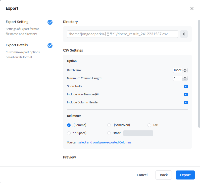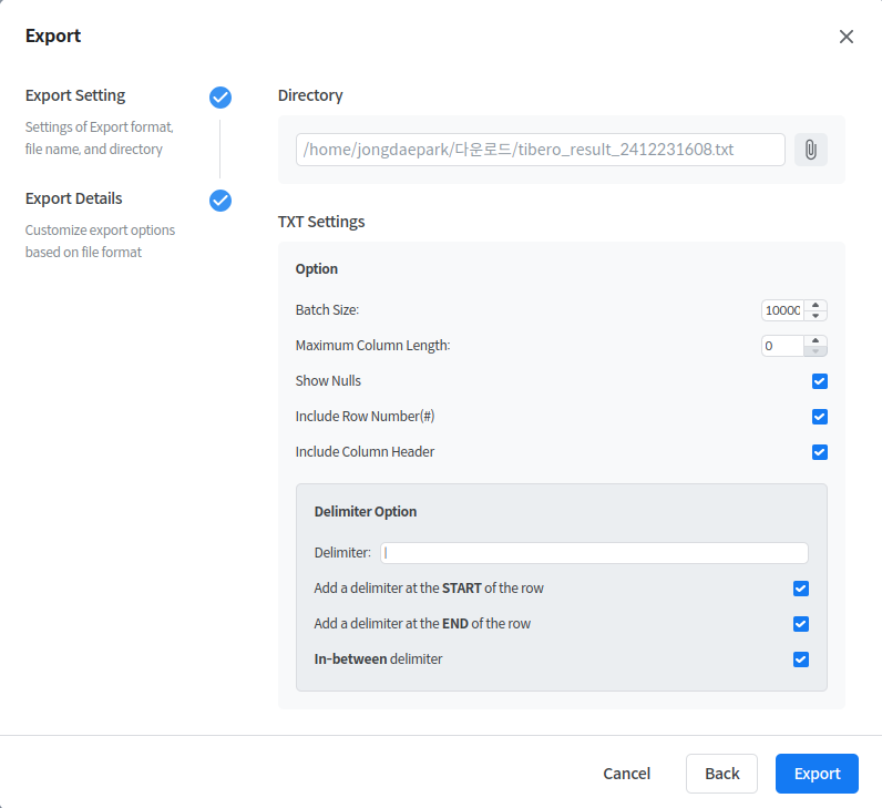 Sets the number of rows of data to write to the file per unit of work. This allows The users to control memory usage when exporting large amounts of data. It is important to set an appropriate Batch Size because large values can increase the speed but can significantly increase memory usage.