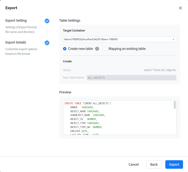 Set the type of result to be exported. Currently, CSV TXT SQL TABLE is supported.