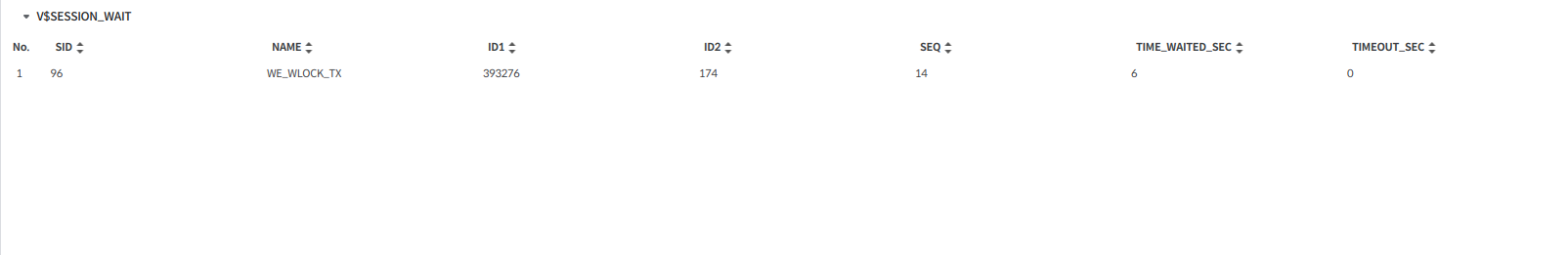 Session Wait는 선택한 세션이 현재 대기하고 있는 이벤트와 대기 대상 자원에 대한 상세 정보를 조회하는 화면이다. 실시간으로 세션이 어떤 리소스 또는 이벤트로 인해 대기 상태인지 확인할 수 있으며, 병목 현상 분석 및 트러블슈팅에 활용할 수 있다.