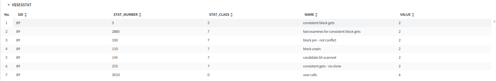 데이터는 V$SESSTAT 뷰를 기준으로 조회되며, VALUE > 0 인 항목만 표시된다.