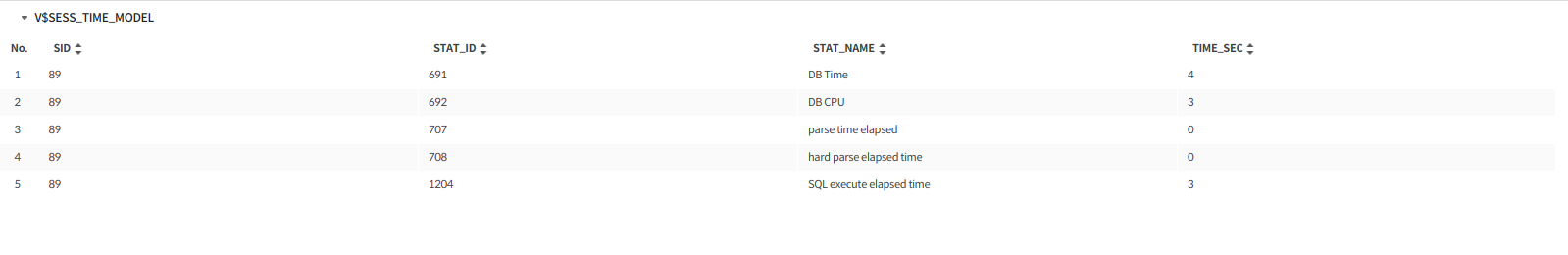 데이터는 V$SESS_TIME_MODEL 뷰를 기준으로 조회되며, VALUE > 0 인 항목만 표시된다.