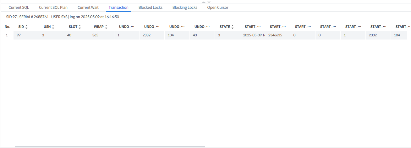 Transaction 탭은 선택한 세션에서 수행 중인 트랜잭션의 상태와 Undo 관련 정보를 상세히 보여주는 화면이다.