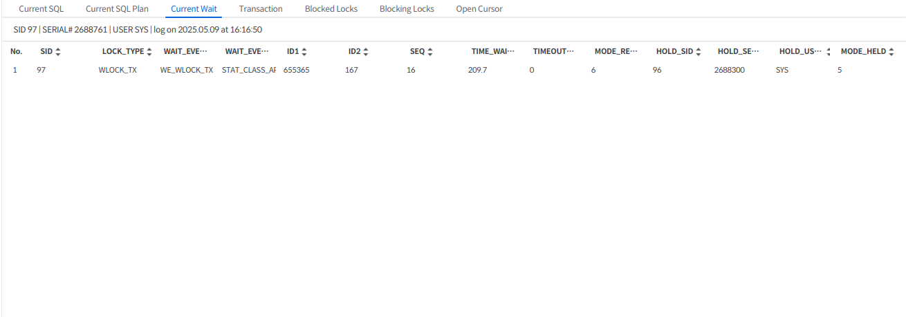 이 탭은 V$WAITER_SESSION, V$SESSION_WAIT, V$SESSION, V$SYSTEM_EVENT 뷰를 기반으로 하며, 세션 간 락 충돌, 자원 대기, 병목 현상 분석에 유용하다.