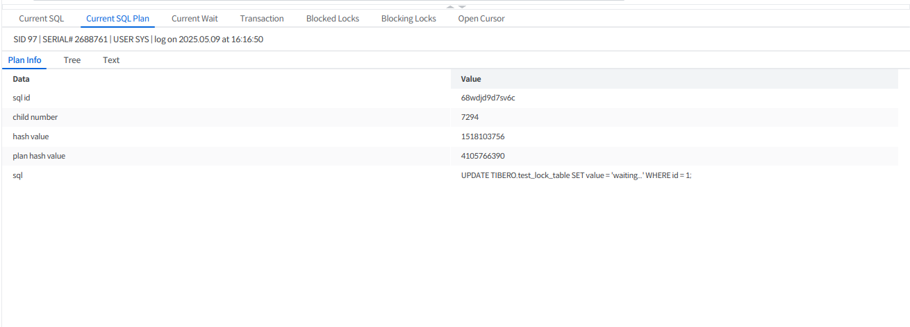 Current Wait 탭은 선택한 세션이 현재 어떤 자원(Resource)에 대해 대기하고 있는지 상세히 보여주는 화면이다.