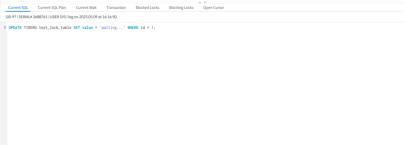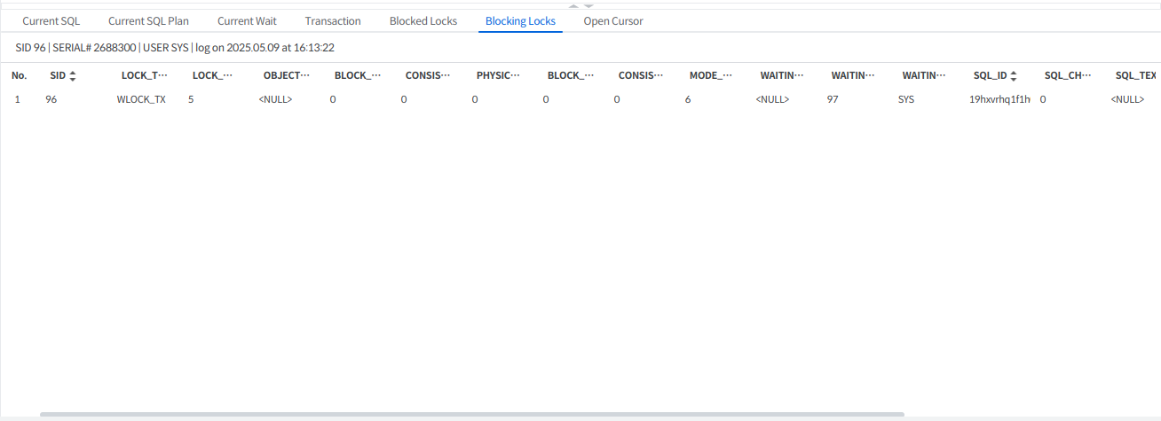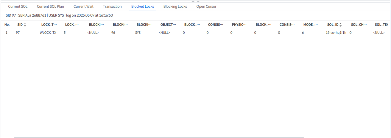 Blocked Locks 탭은 선택한 세션이 현재 다른 세션에 의해 Lock이 걸려 대기 중일 때, 그 세션(Blocking Session)이 어떤 리소스를 점유하고 있으며, 어떤 SQL을 실행 중인지 등을 상세히 보여준다.
