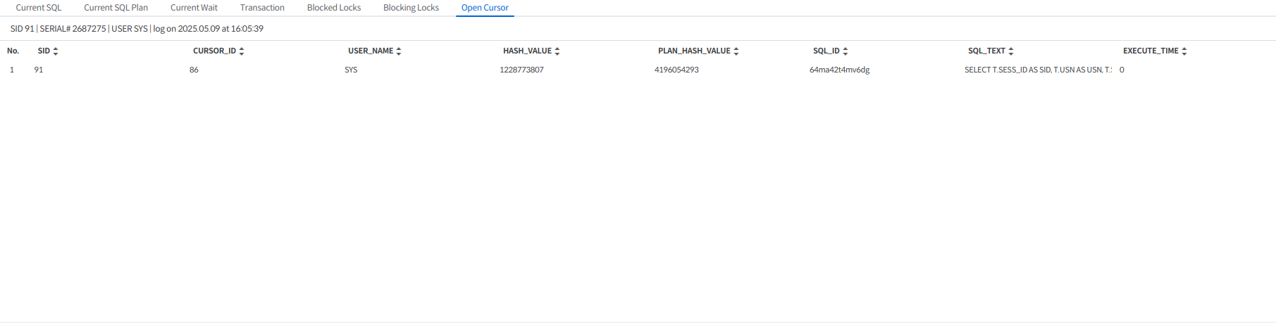 Open Cursor 탭은 선택한 세션에서 Open Cursor 목록을 조회하여, 해당 세션이 실행 중이거나 준비된 SQL에 대한 상세한 정보를 확인할 수 있는 화면이다. 이 탭은 커서 수가 많은 세션의 리소스 사용 상태를 파악하거나, 커서 누수(leak) 여부를 진단하는 데 유용하다.