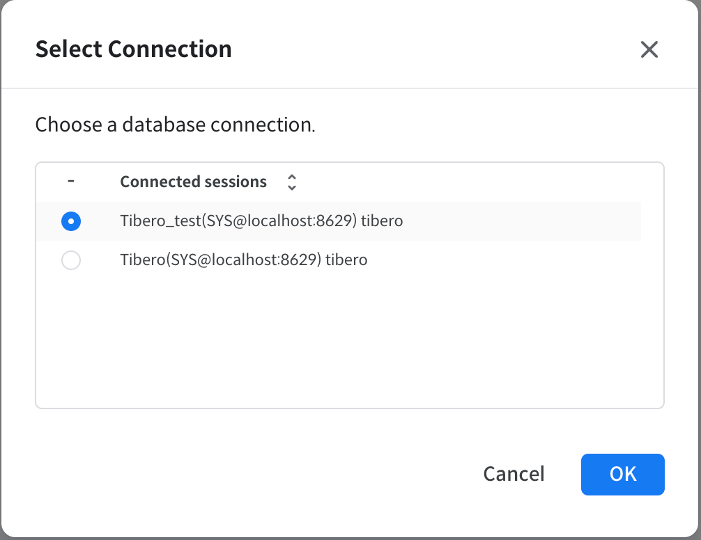 Tablespace Manager에 사용할 Connection 정보를 선택하는 단계이다. Connection은 하나만 선택 가능하며, 항목 선택 후 [OK] 버튼 클릭 또는 더블 클릭으로 진입할 수 있다.