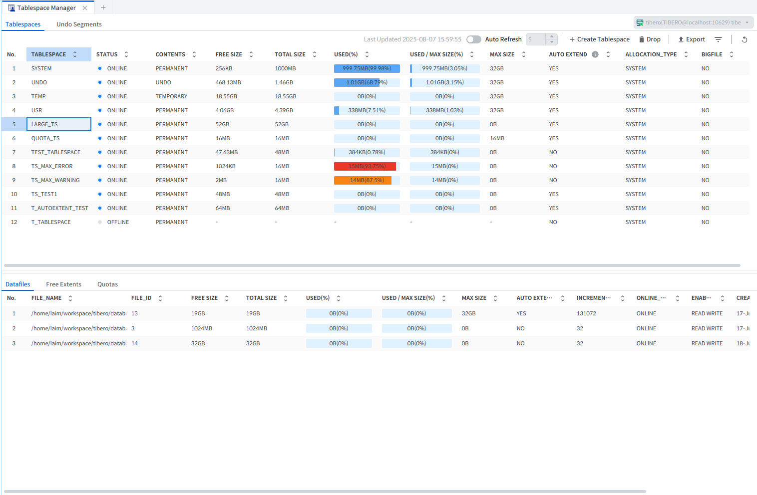 상단 영역에서는 현재 연결된 세션에서 조회 가능한 테이블스페이스가 테이블 형태로 표시되며, 각 테이블스페이스의 상태, 사용량, 여유 공간, 최대 용량 등을 확인할 수 있다. 상단 영역은 테이블스페이스 조회 및 제어를 위한 Toolbar와 테이블스페이스 목록을 표시하는 테이블(Tablespace List Table)로 구성되어 있다.