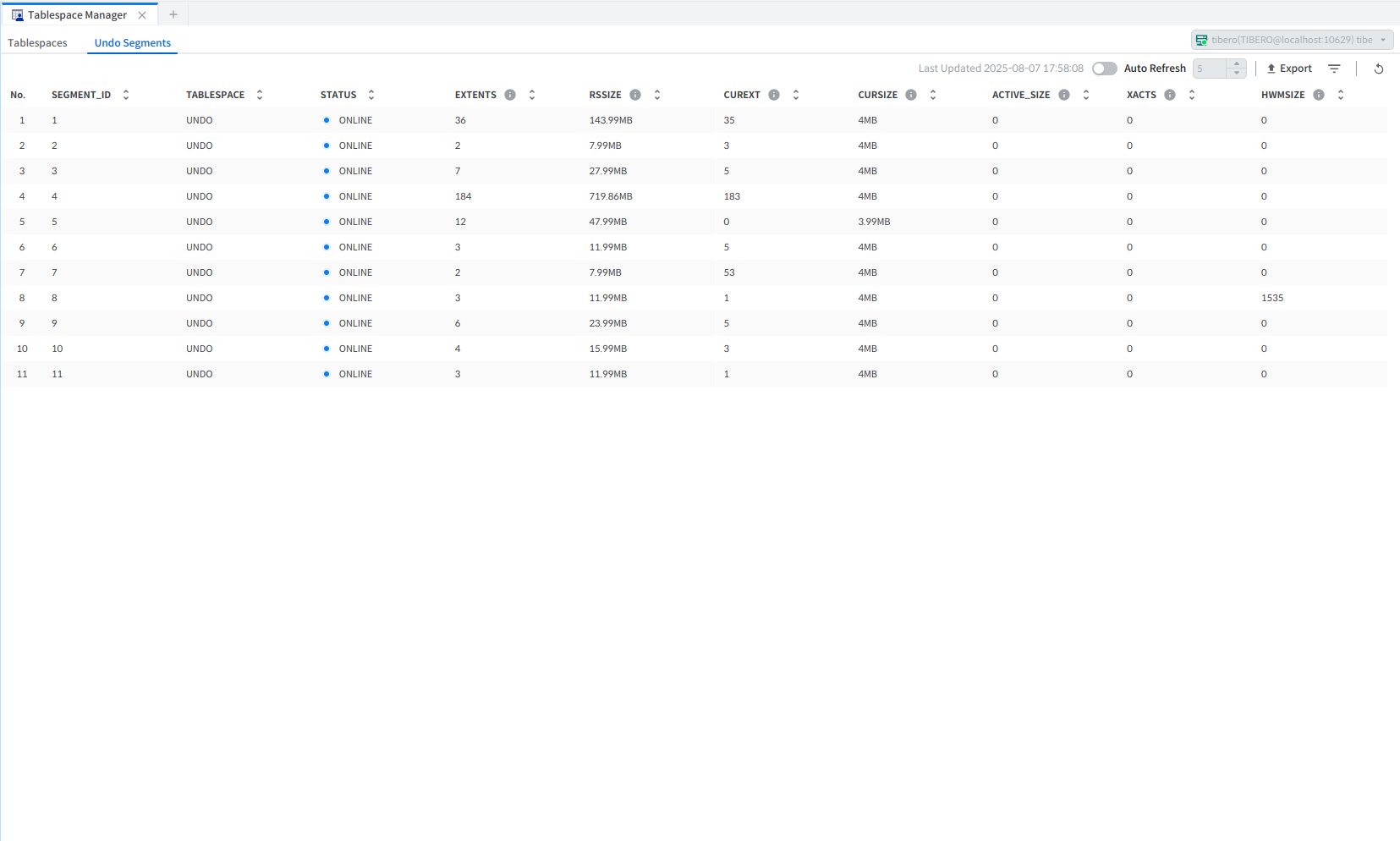 Undo Segments에서는 데이터베이스 내 언두 세그먼트 목록을 조회할 수 있다. 언두 세그먼트 목록, ID, 테이블스페이스명, 상태 등을 확인할 수 있다.