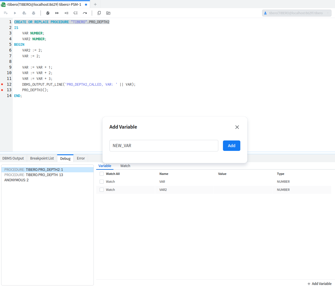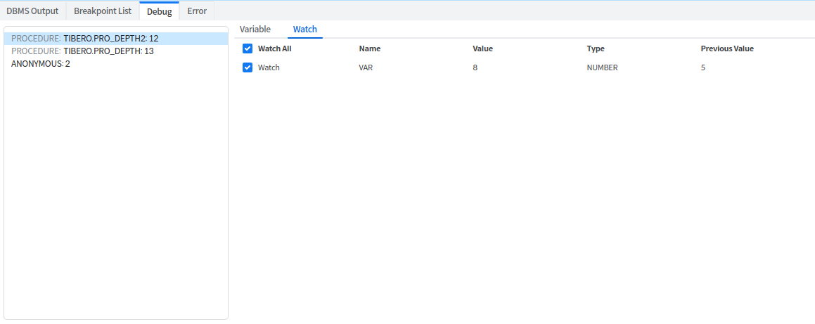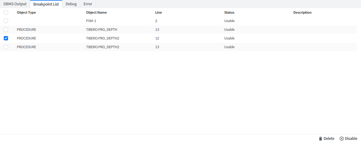 Object Type: Breakpoint가 지정된 Object의 Type (PROCEDURE / FUNCTION / PACKAGE BODY), Editor에 작성된 Breakpoint의 경우 빈 값이 표시된다.