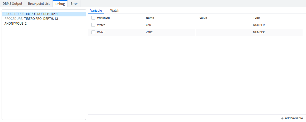 Variable 탭에서는 선택된 스코프의 모든 변수의 Name, Value, Type을 표시한다. 스크립트를 분석하여 해당 프로그램에 존재하는 변수들을 자동으로 등록한다. 추가로 변수를 등록하려면 Variable 탭 우측 하단의 [+ Add Variable] 버튼을 통해 변수를 등록할 수 있다. 또한 테이블의 Watch Column의 체크박스 및 Context 메뉴를 통해 특정 변수 또는 변수 전체의 Watch 상태를 변경할 수 있다.
