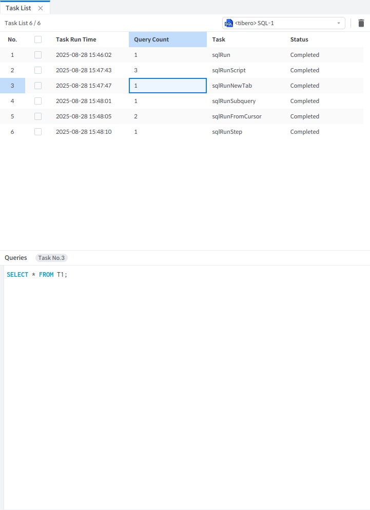 Task List 탭에서는 선택한 에디터 세션에 관련된 다음과 같은 내용을 조회할 수 있다.
