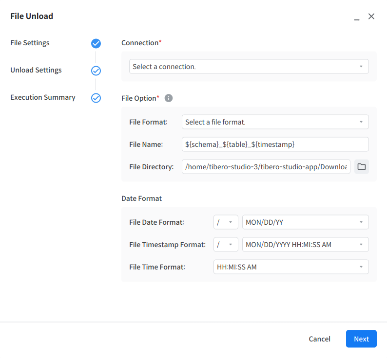 File Unload 기능은 File Settings, Unload Settings, Execution Summary 의 단계로 구성되어 있다.