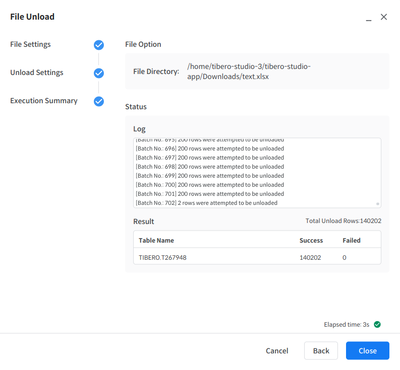 Execution Summary 에서는 수행한 Unload 작업의 File Directory, Log, Result 정보를 확인할 수 있다.