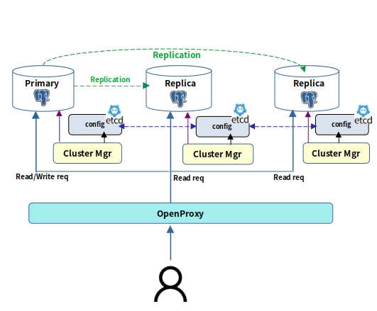 OpenHA Cluster Manager Patroni 기반의 클러스터 관리 모듈로, 각 데이터베이스 노드의 상태를 실시간 감지하고 자동 Failover, Primary 노드 선출, 구성 변경 관리 기능을 수행합니다.