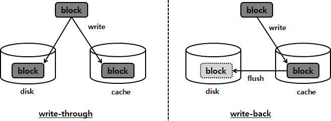 Flash devices provide fast I/O performance and non-volatile low storage space. There are two ways to write data to the cache: write-through and write-back, as shown in the figure.
