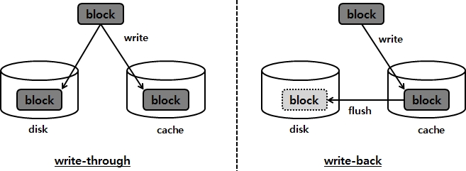 플래시 디바이스는 빠른 I/O 성능과 비휘발성 저장 공간을 제공합니다. 캐시는 데이터를 쓰는 방법에 있어서 아래 그림과 같이 write-through 방식과 write- back 방식이 존재합니다.